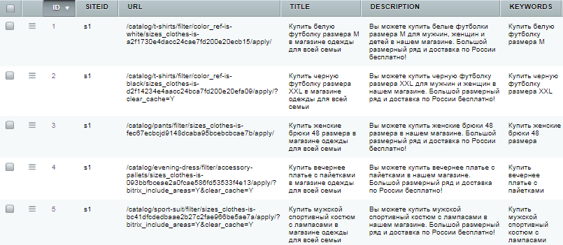 Особенно удобен этот инструмент при работе с тегированием на страницах «умного фильтра». Для каждой позиции фильтрации можно выставить свои значения.