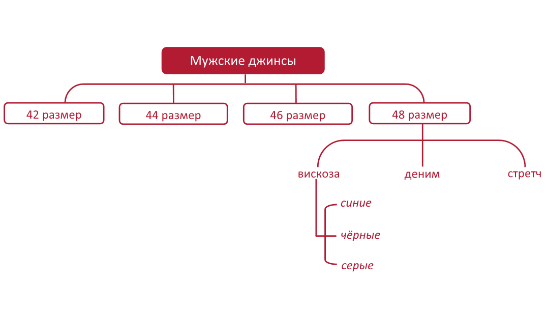 Подобной ситуации можно избежать путём создания разделов. Вот тут у нас женские джинсы, тут мужские, а тут детские. В разделах создаём подразделы и разбиваем каждую категорию по размерам и т. д. Получается, если клиент приходит по запросу «мужские джинсы», он просто «спускается» по структуре сайта глубже, фильтруя все товары и оставляя только те, которые удовлетворяют его требованиям (например, «мужские джинсы 48 размера из вискозы, синие»).