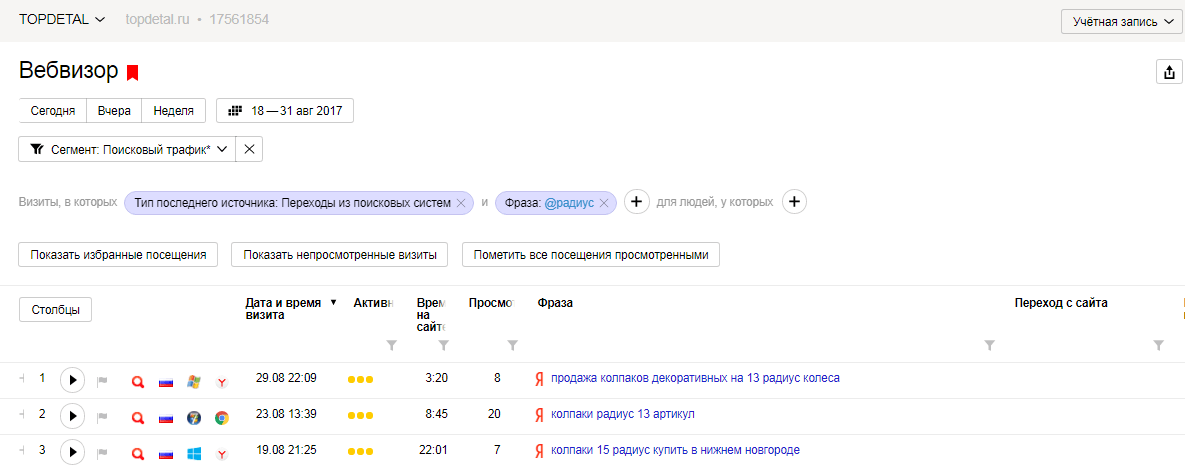 Статистика по ключевым запросам, использованным в мае (позиции сняты в августе 2017 г.) Статистика по ключевым запросам, использованным в июне (позиции сняты в августе 2017 г.) Примеры НЧ запросов, по которым пользователи приходят на сайт из поисковиков Обратите внимание на глубину просмотра и время на сайте: по каждому НЧ запросу переходов немного, но они качественные, с высоким шансом монетизации лида. Поскольку это низкочастотники, мы стараемся собрать их по максимуму.